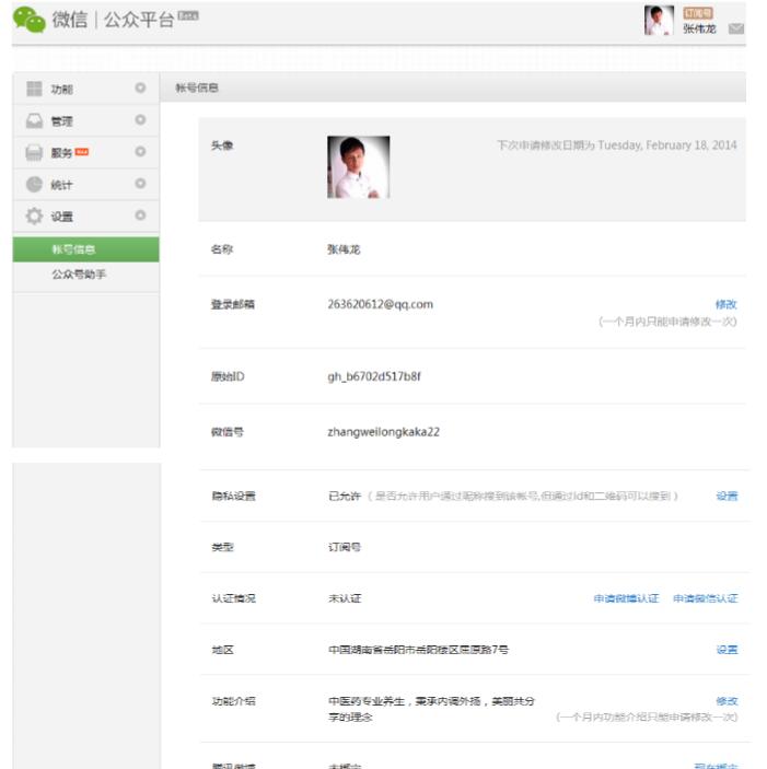 設(shè)置微信公眾平臺(tái)信息。 登陸后,左側(cè)共有五個(gè)選項(xiàng)分別為【功能】【管理】【服務(wù)】【統(tǒng)計(jì)】【設(shè)置】 點(diǎn)擊【設(shè)置】里的【賬號(hào)信息】:以下是需要更改的要點(diǎn)(見(jiàn)下圖)